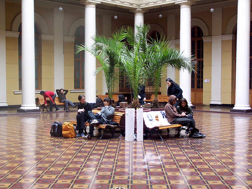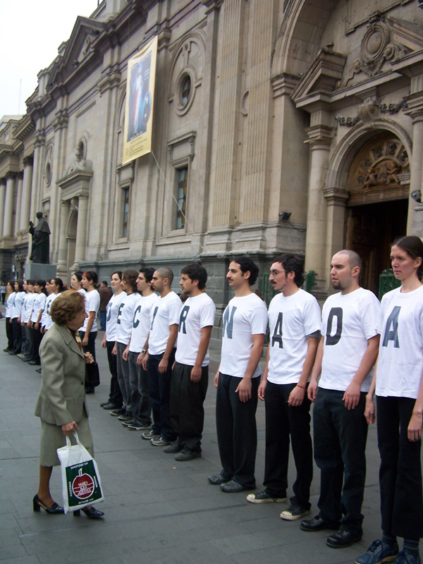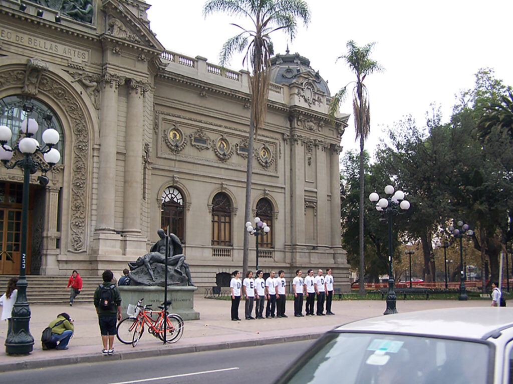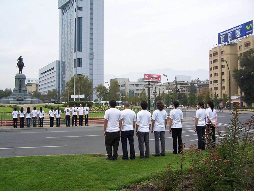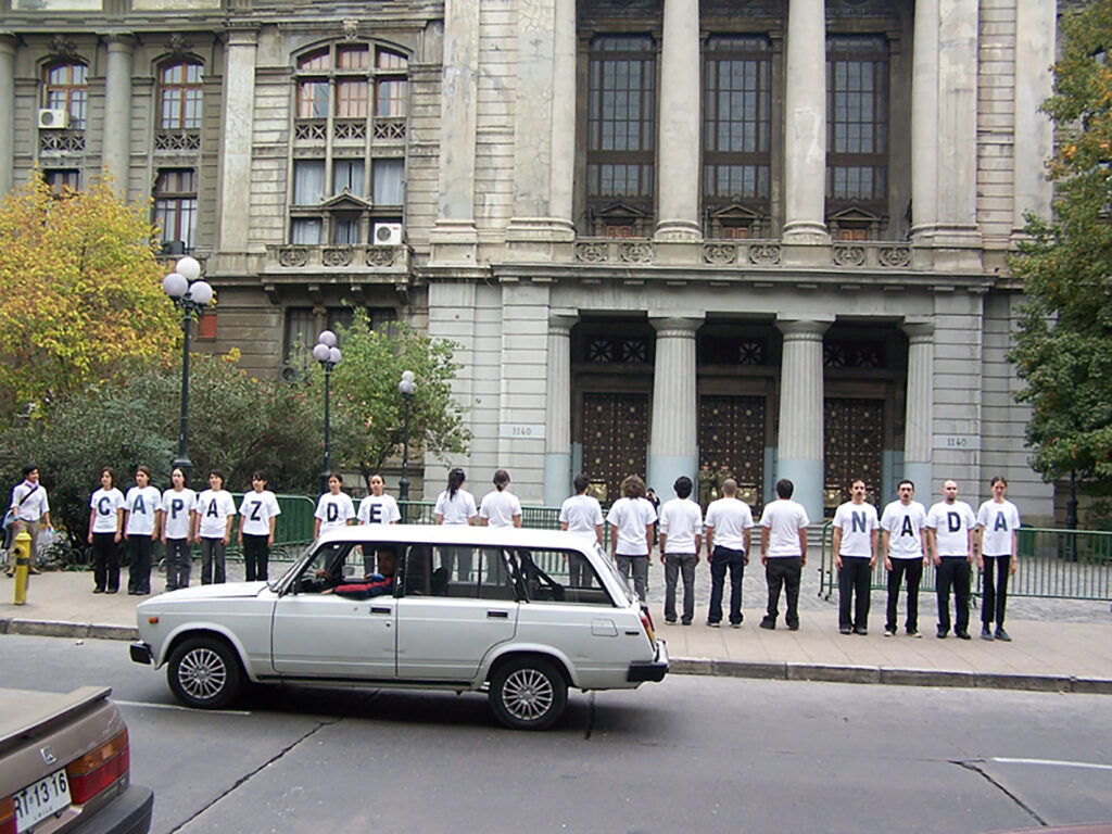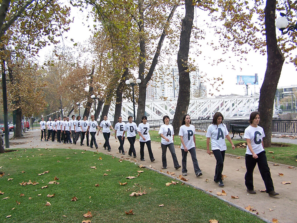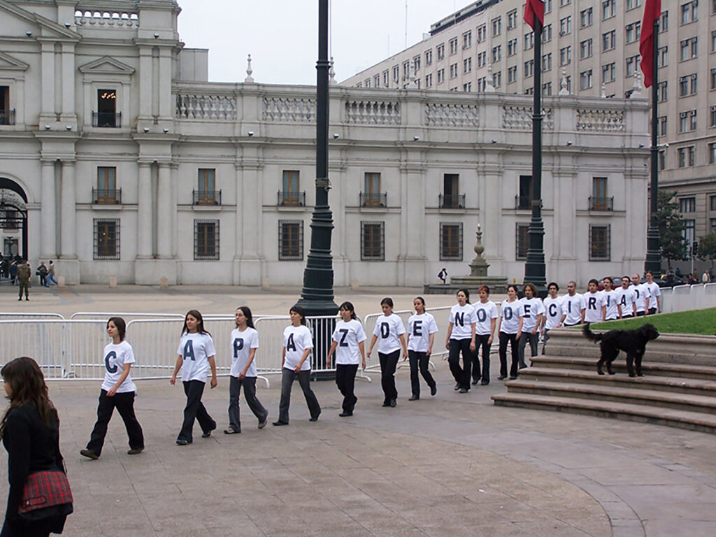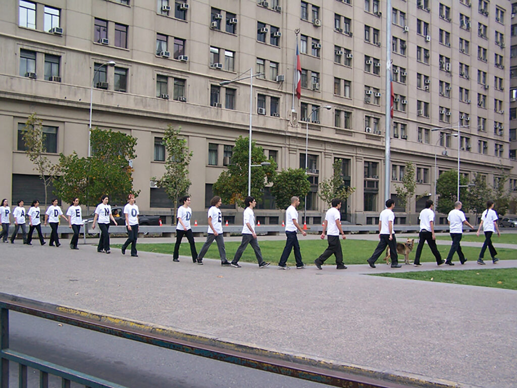 Desplazamiento colectivo a lo largo del eje cívico de la ciudad, con detenciones en puntos significativos, protagonizado por performers vestidas con poleras blancas con letras negras, pantalones y zapatos negros. En conjunto, sus cuerpos conformaban el texto “CAPAZ DE NO DECIR NADA” y sus diversas variaciones